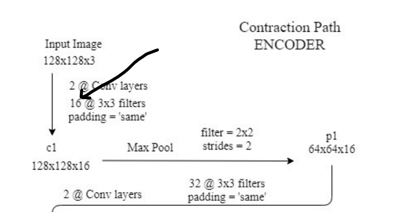 我试图复制UNET体系结构,但在理解为什么在编码器部分中写入16时遇到了问题: