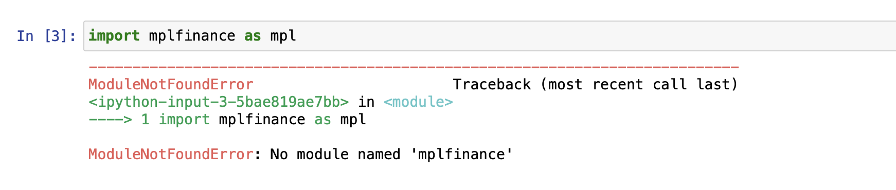 这种类型的错误与mplfinance本身无关。导致“模块未找到”问题的最常见(但不仅仅是)原因(不管包是什么,假设模块已经安装)是包或模块安装在一个地方,但是python的导入路径正在寻找其他地方。