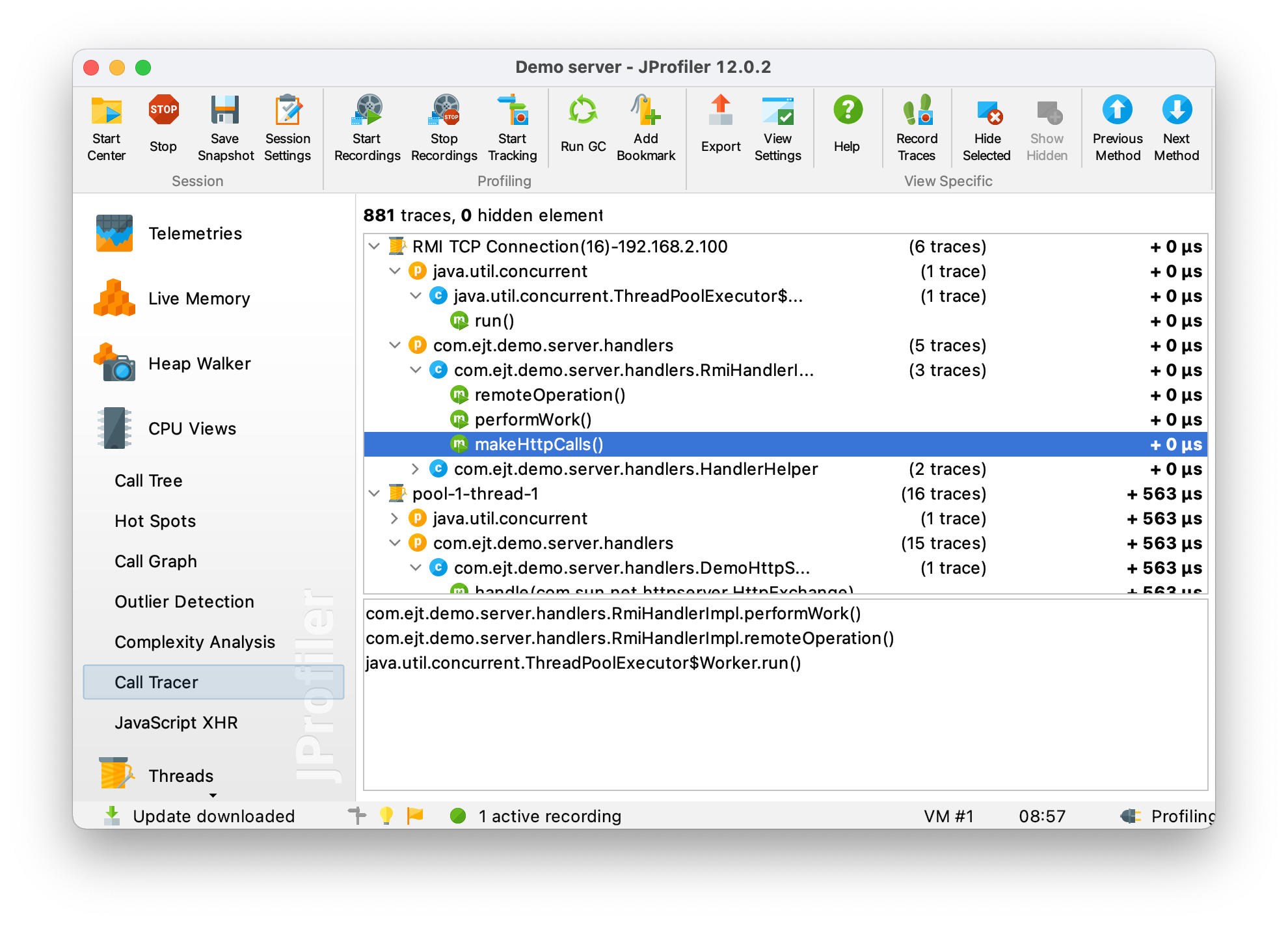 然而,JProfiler与其调用跟踪器视图有类似之处。它不是显示为时间线,而是显示为线程、包、类和实际方法调用的层次树。