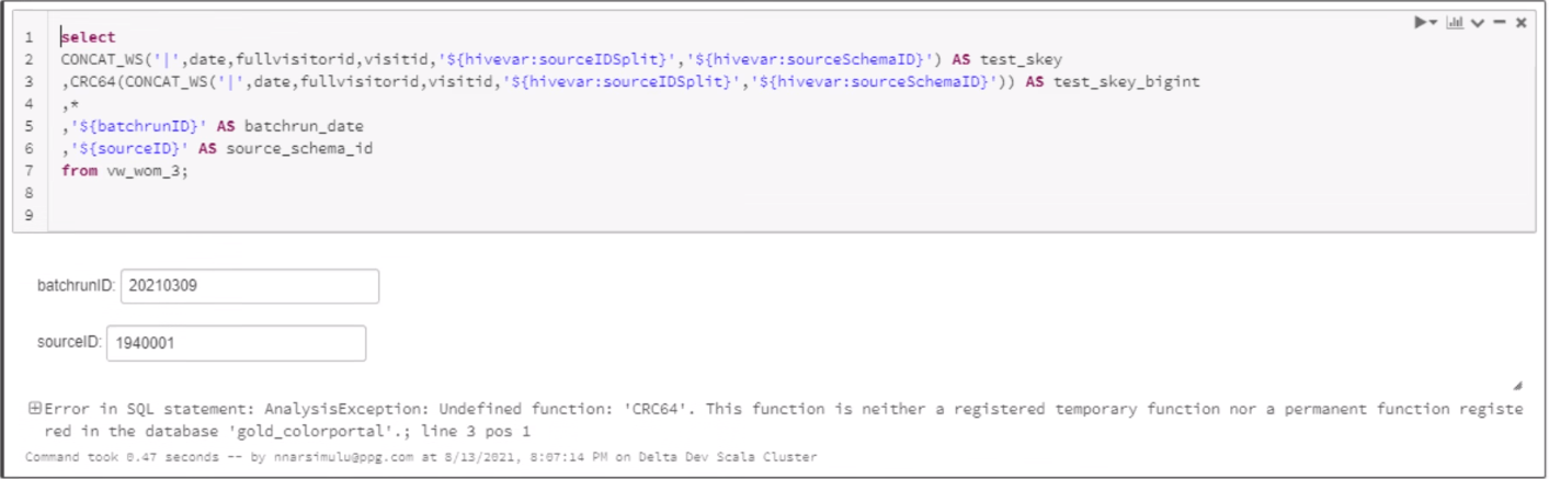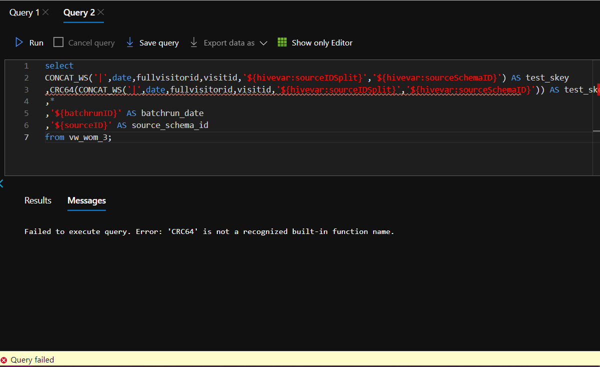 ,CRC64(CONCAT_WS('|',date,fullvisitorid,visitid,'${hivevar:sourceIDSplit}','${hivevar:sourceSchemaID}')) AS test_skey_bigint