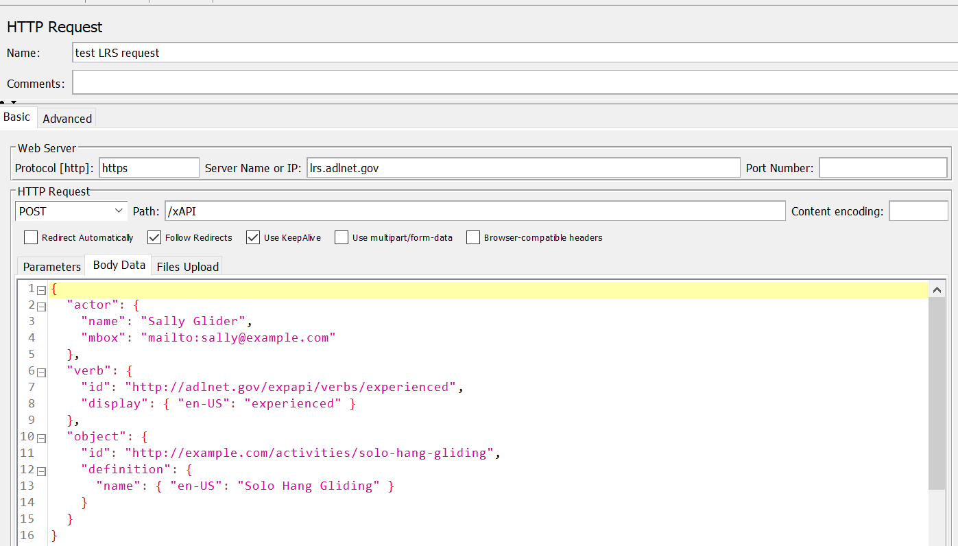 我试图将xAPI语句从“活动提供者”发送到ADL现场演示。目标是从我的C# .NET应用程序中实现这一点,但是我在实现它时遇到了困难,所以我尝试从JMeter运行一个简单的POST请求。