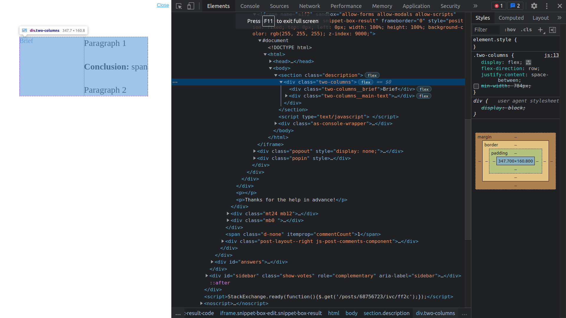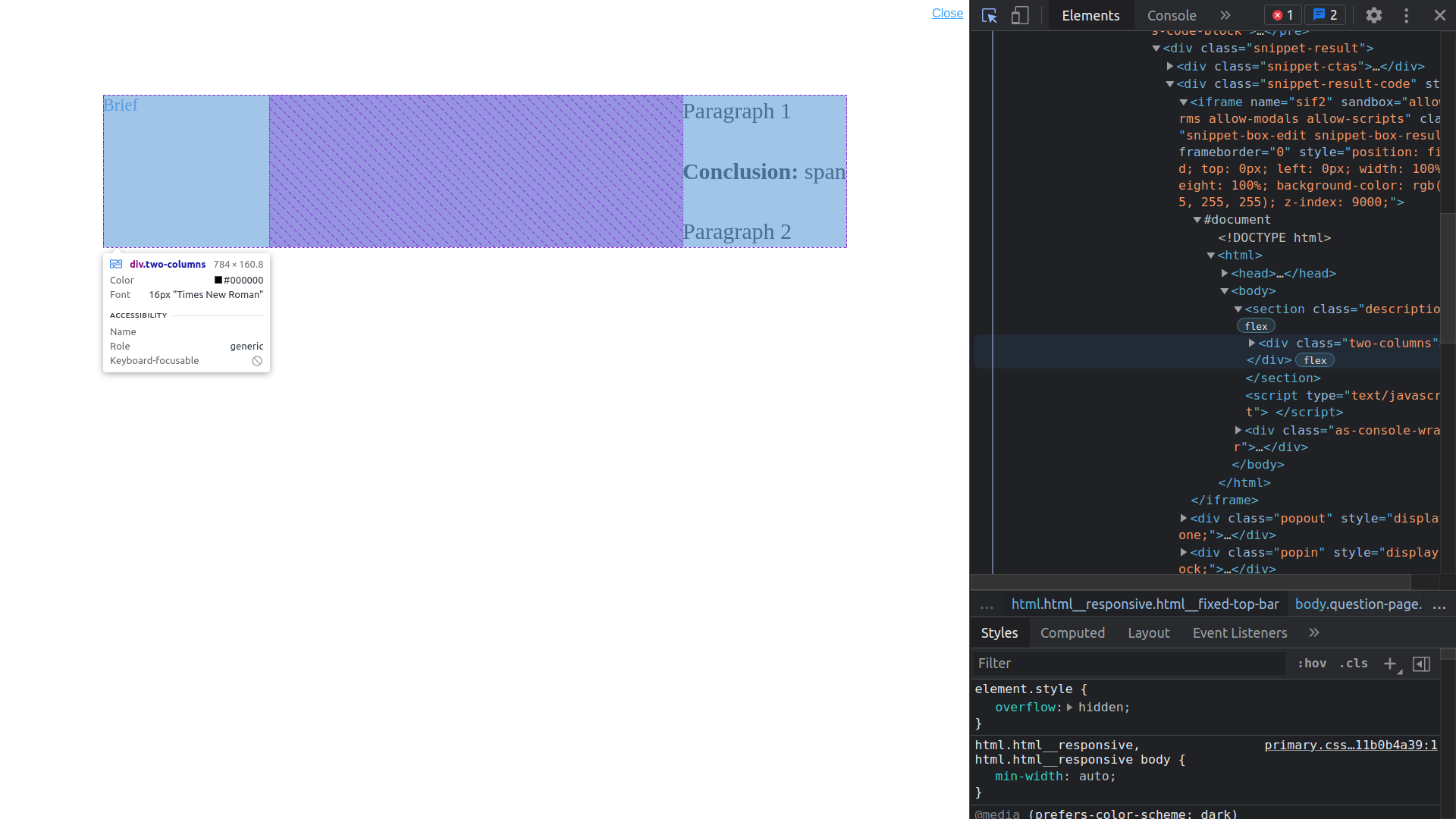 所以,您的代码是正确的,它是完全工作的,但是由于蓝色元素(.two-columns)中的宽度错误,它显示了错误的结果。