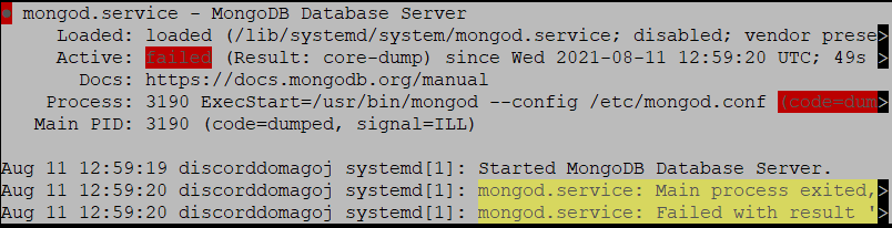 已加载(/lib/systemd/ MongoDB / mongod.service;禁用;供应商prese> Active:prese>(结果: core-dump),自Wed 2021-08-11 12:59:20 UTC;49 s> Docs:https://docs.mongodb.org/manual Process: 3190 ExecStart=/usr/bin/mongod.conf /etc/mongod.conf (code=dum>主PID: 3190 (code=dumped,signal=ILL) ) 8月11日12:59:19不协调的1:MongoDB数据库服务器启动。8月11日12:59:20不协调的1:mongod.service:主进程退出,> Aug 11 12:59:20不协调的系统1:mongod.service: Failed '>