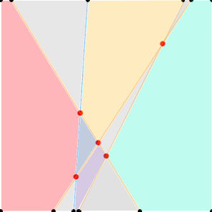 这里有一个示例图像,其中有4行用红色标记的相交点分割画布。我还保存了每个随机生成的行的顶部和底部点(用黑色标记),加上画布的四个角分别位于x和y位置的相同数组中(px,py)。