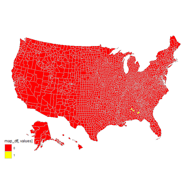 dplyr::mutate(selected = factor(ifelse(fips %in% stringr::str_pad(vec, 5, pad = "0"), "1", "0")))第二步是使用生成的数据集构建映射,并根据新创建的变量填充颜色: