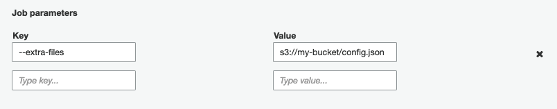 根据https://docs.aws.amazon.com/glue/latest/dg/aws-glue-programming-etl-glue-arguments.html,有一个名为--extra-files的参数,它被称为配置文件等其他文件的S3路径。当我创造我的工作时,我似乎在控制台上找不到这个。