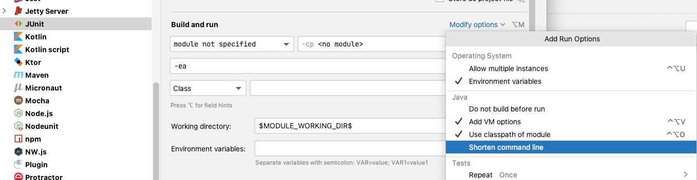 在该对话框中选择JUnit,单击"Modify“并选择Shorten command line