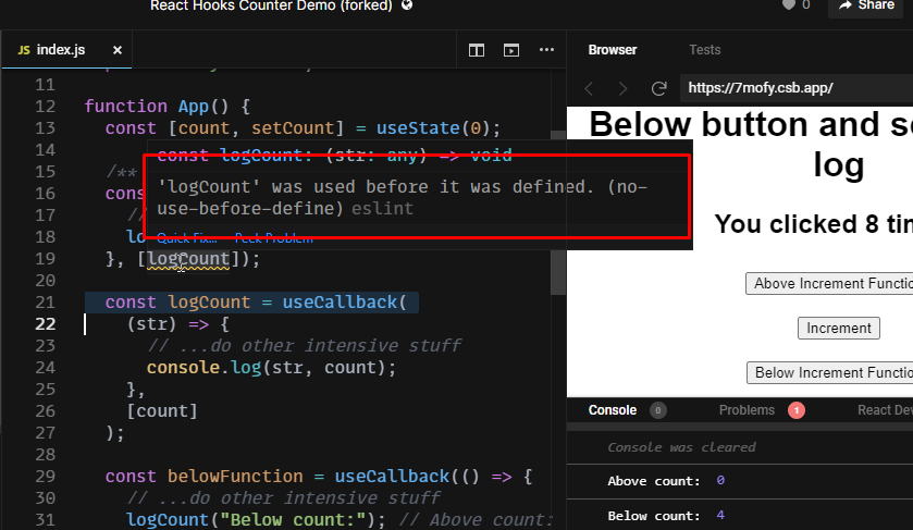ReactDOM.render(<App />, rootElement);显然,useCallback声明的顺序对于代码的工作非常重要。但是,如果我们这样写它,https://codesandbox.io/s/react-hooks-counter-demo-forked-7mofy?file=/src/index1.js
