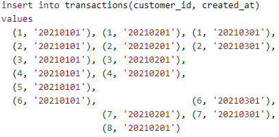 我正在努力找出我们每个月获得的新客户的保留期。已经从事务中识别了新客户逻辑,我对如何启动M1到M10没有线索