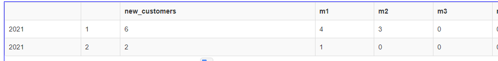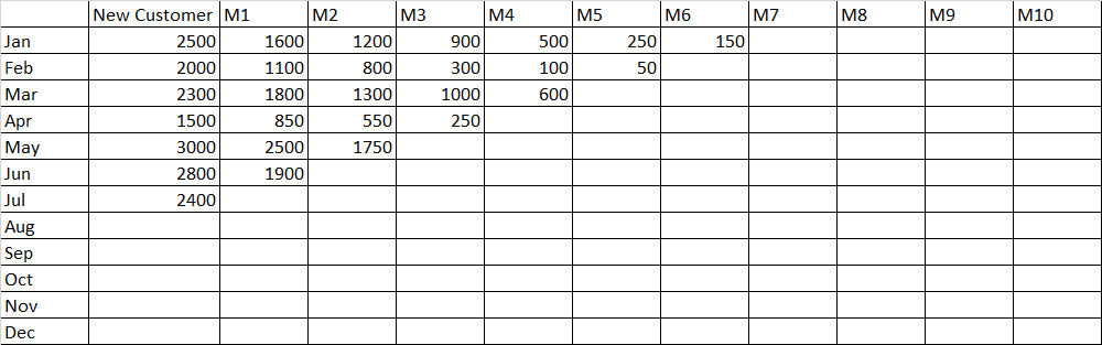 我需要如下所示,来解释一下表,在1月份我们获得了2500个客户,其中25000个新客户中只有1600个在M1(2月)交易,在1600个只有1200个在M2(Mar)中交易等等。