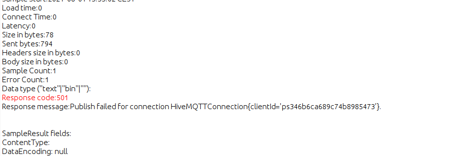 INFO: ** [clientId: ps303411a2200c4e1ca4f34, topic: /test/, payload: 1627830273593ts Publish failed for connection HiveMQTTConnection{clientId='ps303411a2200c4e1ca4f34'}.