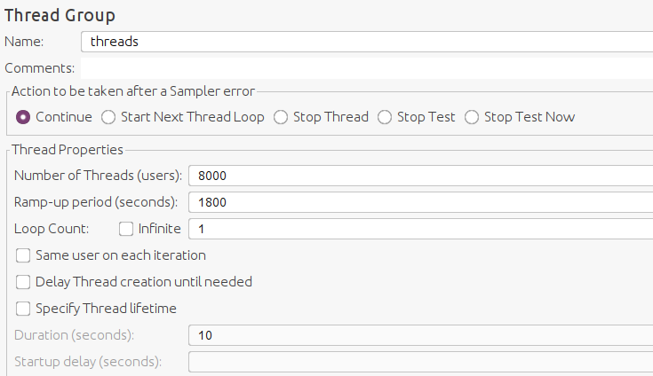 如果您没有在JMeter日志中看到任何可疑的东西--这很可能意味着您的服务器超载,无法处理那么多并发连接/消息,那么连接就会中断。