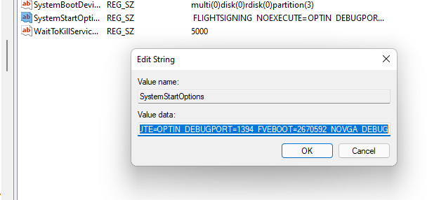 FLIGHTSIGNING NOEXECUTE=OPTIN DEBUGPORT=1394 FVEBOOT=2670592 NOVGA DEBUG