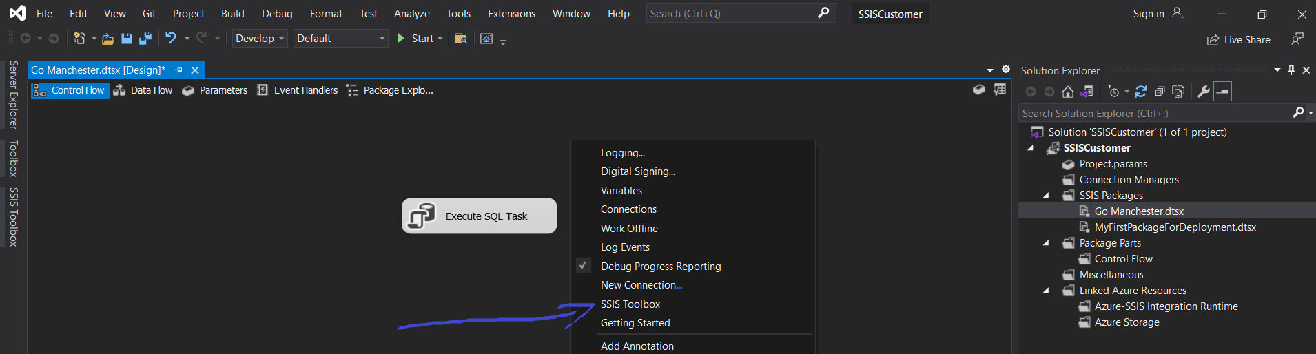我在“工具箱”中看到了这条信息,但是当我们在SSIS中工作时,我们需要"SSIS工具箱“