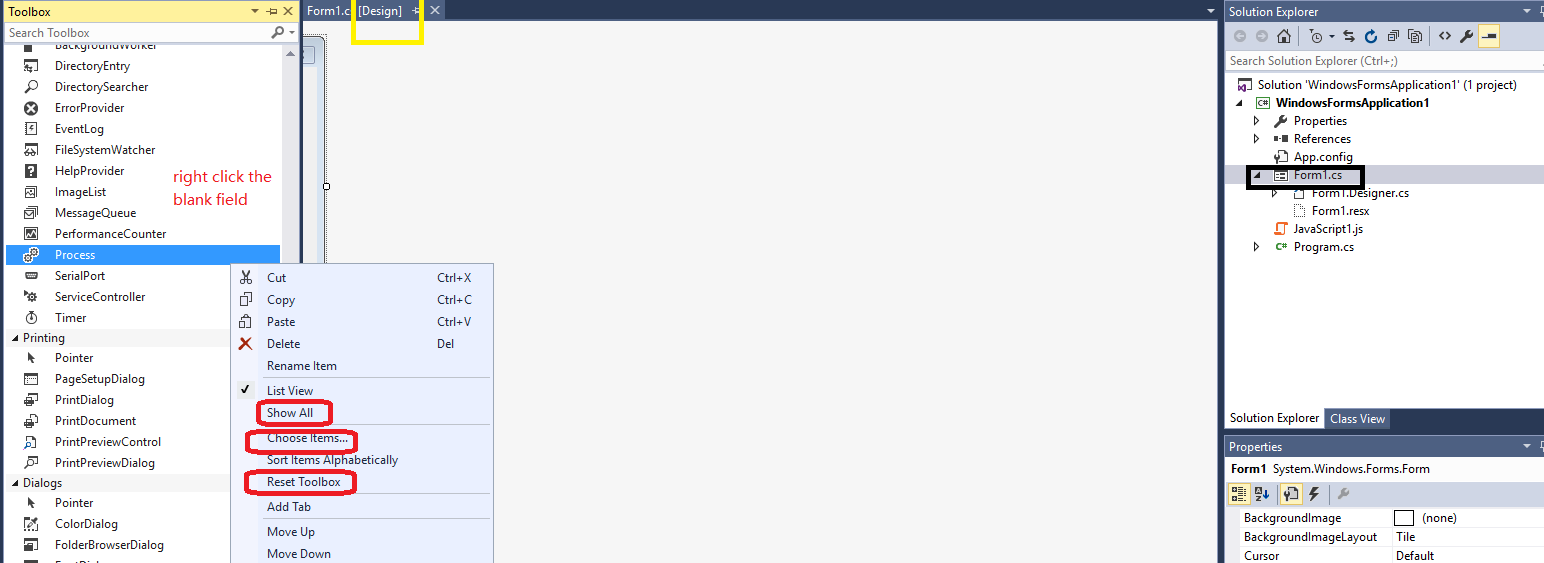 如果您已经处于“设计”模式下,可以在“工具箱”字段中右键单击并选择Show All、Reset Toolbox或Choose Item,然后添加控件或将其重置,如下所示: