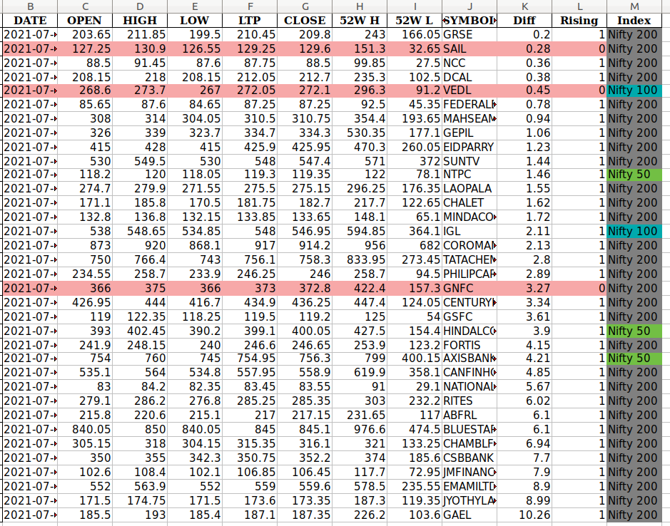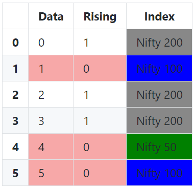 这就是我希望Dataframe看起来的样子:如果Rising是False or 0,那么整个行就是红色的。Index的颜色取决于它是否来自Nifty-50/100/200