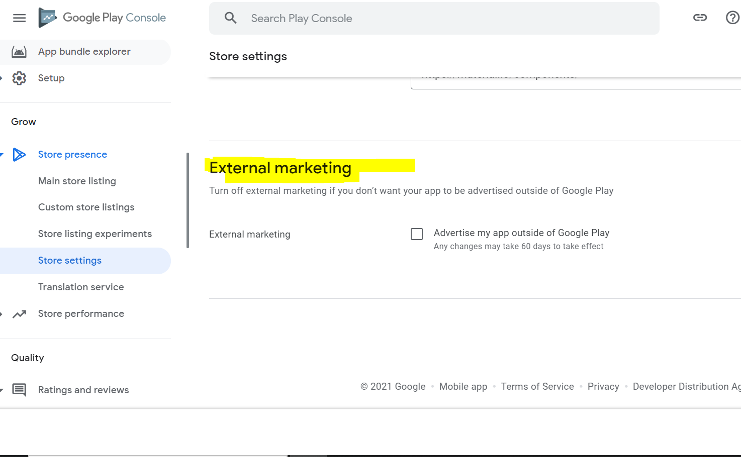 您可以取消“外部营销”,以限制您的应用程序在谷歌所有的物业推广。