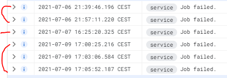 resource.type="ml_job" AND textPayload:"Job failed" AND labels."ml.googleapis.com/job_state":"FAILED"我面临的问题是,顶点AI将重新尝试作业3次,然后宣布该作业为失败,但在日志文件中的信息是相同的。下面有3个例子,只有最后一个失败了3次,最后才失败了。