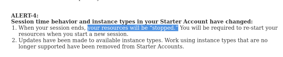 当您的会话结束时,您的资源将被“停止”。当您启动新会话时,将需要重新启动资源。