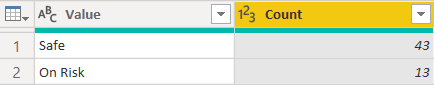 #"Grouped Rows" = Table.Group(#"Removed Columns", {"Value"}, {{"Count", each Table.RowCount(_), Int64.Type}})