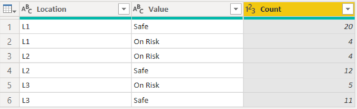 #"Grouped Rows" = Table.Group(#"Removed Columns", {"Location", "Value"}, {{"Count", each Table.RowCount(_), Int64.Type}})