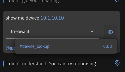 当我尝试一个短语,show me device 192.168.1.1华生是无法确定的意图。沃森确实认识到,我已经输入了一个ip实体,它是IPv4格式的。注:我只有一个意图和一个实体的技能在这个时候。为了达到目的,我在对话框中添加了一个节点。