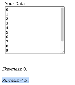 我在Wolfram和这个在线的峰度计算器上测试了这一点:https://www.socscistatistics.com/tests/skewness/default.aspx