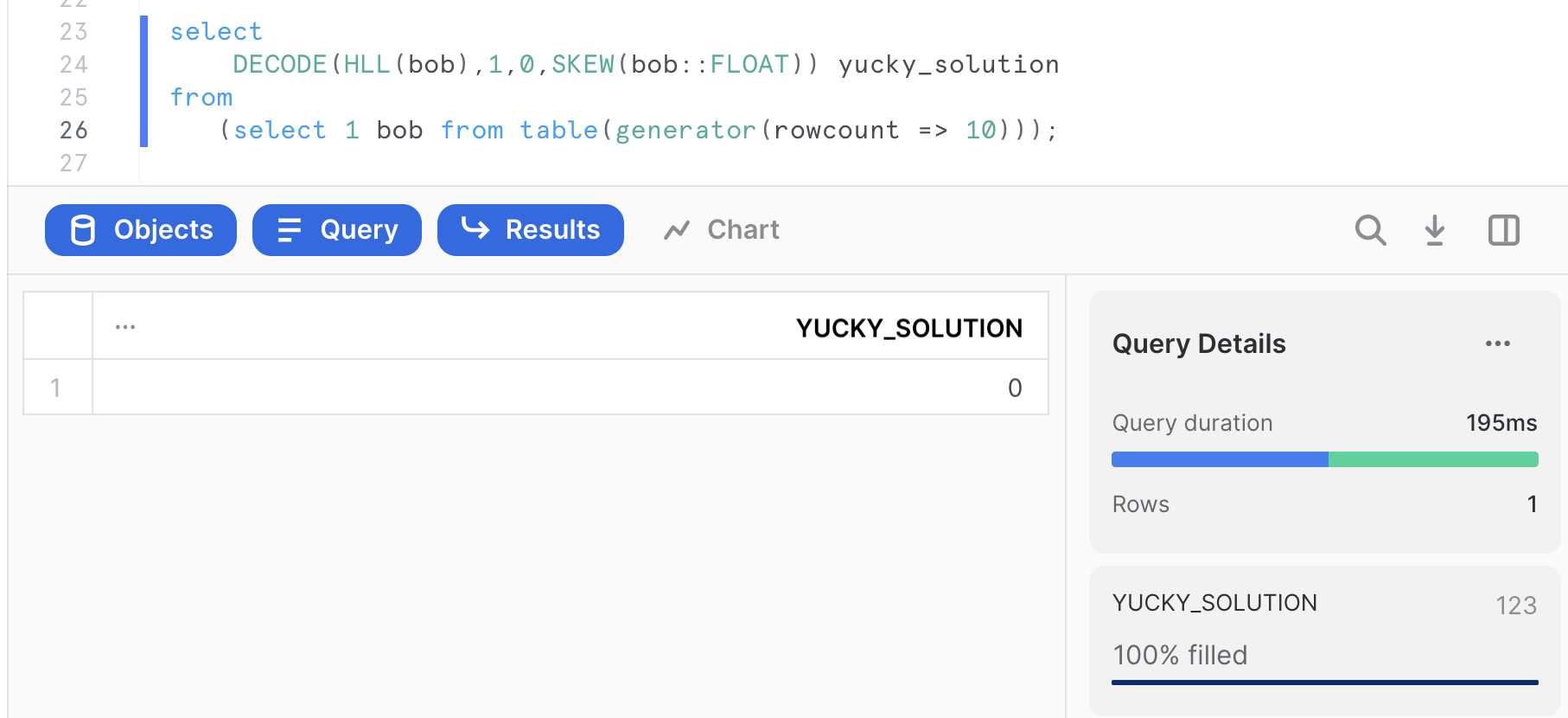 DECODE(HLL(bob),1,0,SKEW(bob::FLOAT)) yucky_solution