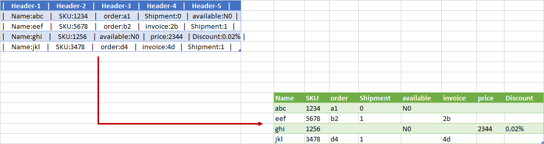 | Name:jkl | SKU:3478 | order:d4 | invoice:4d | Shipment:1 |现实:第3、第4和第5列的(标题:info)数据在整个列中不一致