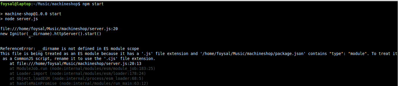 This file is being treated as an ES module because it has a '.js' file extension and '/home/foysal/Music/machineshop/package.json' contains "type": "module". To treat it as a CommonJS script, rename it to use the '.cjs' file extension.
