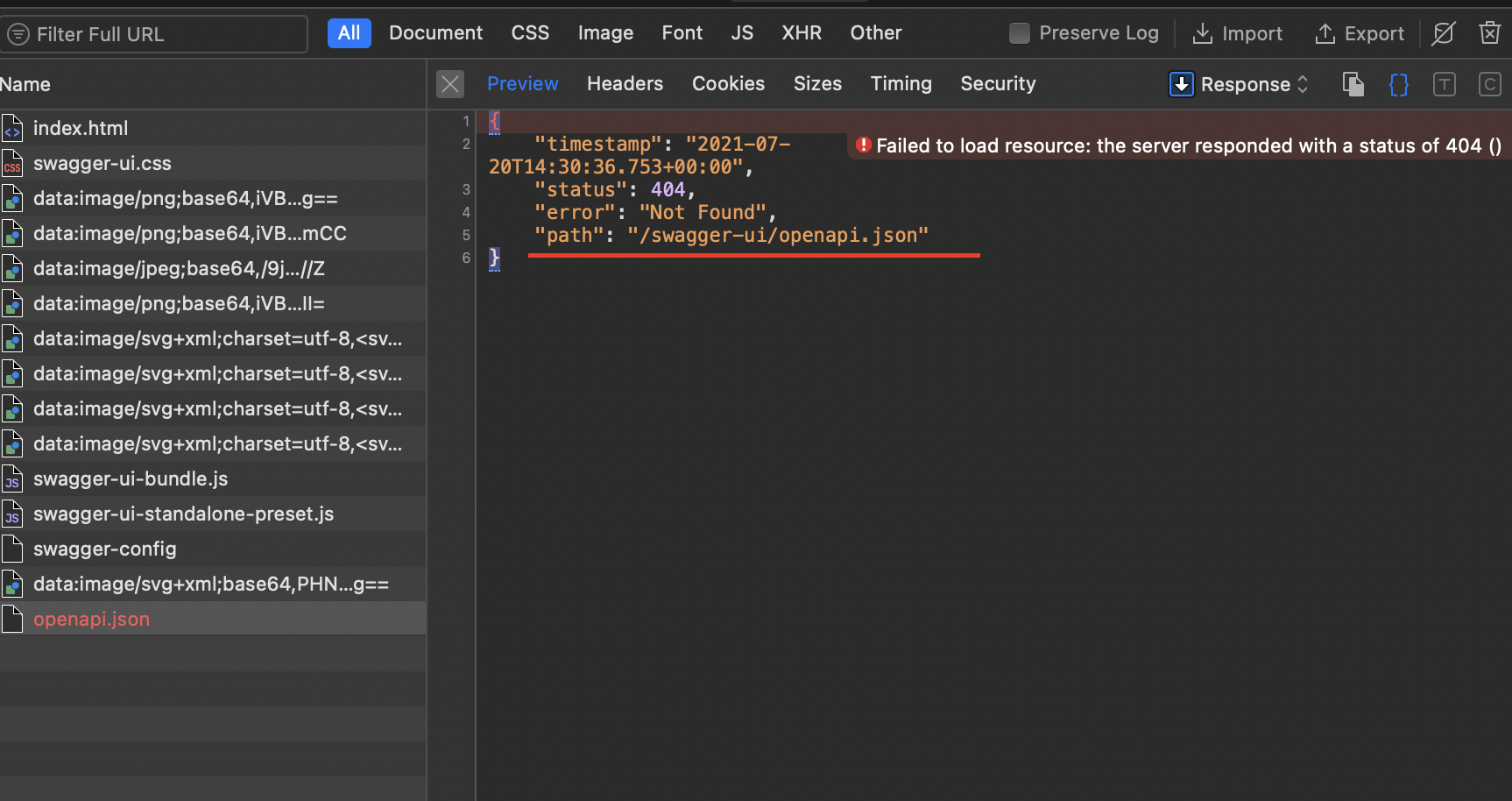 因此,它使用/swagger/ in路径,无法到达资源。我的openapi.json可用简单的http://localhost:8080/openapi.json,但w/o前缀。