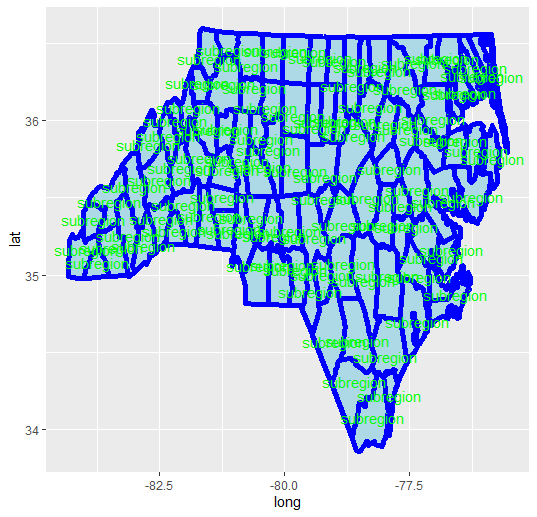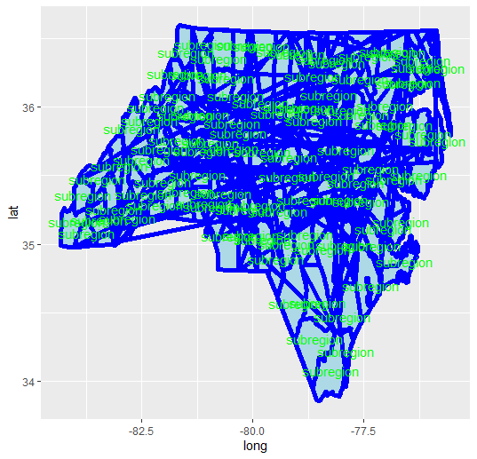 geom_text(data = cnames, aes(x = long, y = lat, label = "subregion"), color = "green")做了这件事,但是破坏了geom_path()层。