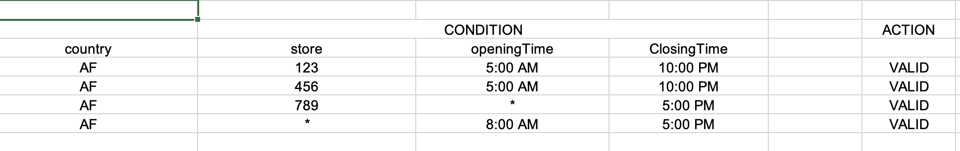 现在,在第4条规则中,我的存储号是*,现在我试图添加一个规则,如果没有从第1行执行到第3行,那么无论哪个存储区,只有我的第4条规则都应该执行。