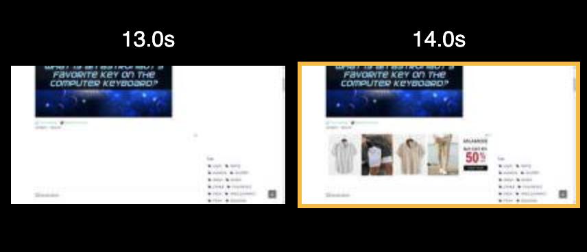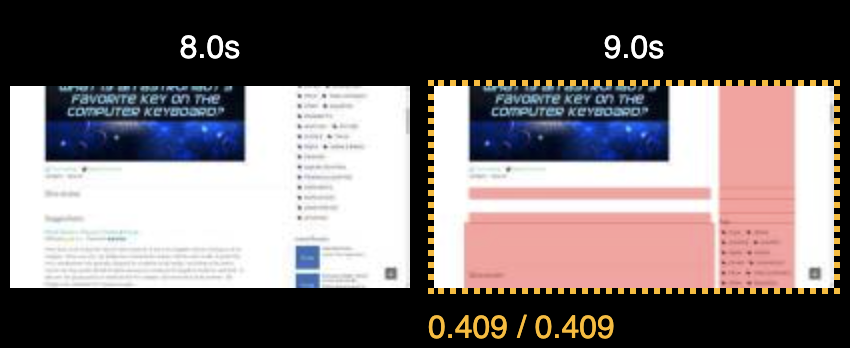 上面的电影片视图和视频演示了这个问题。在页面部分加载并在8秒点向下滚动之后,我们可以看到广告异步加载并将其下方的内容向下推送,导致版面移位,得分为0.409,足以使页面体验被评估为“差”。