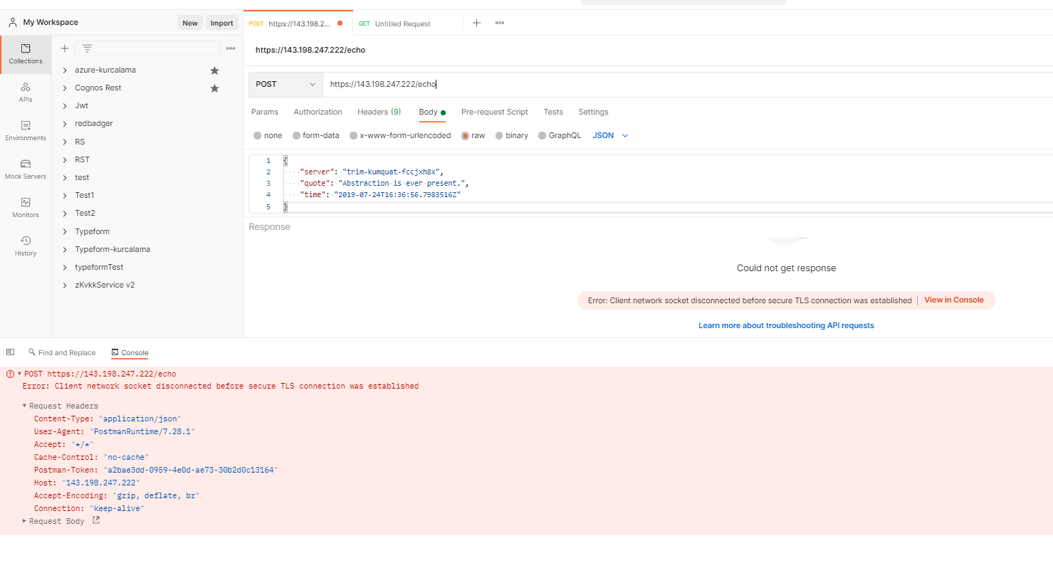 但是当我通过https发送请求时(请看上面的邮递员),它会返回错误:“错误:在建立安全的TLS连接之前断开连接的客户端网络套接字”。