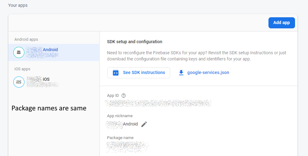 不,iOS和Android应用程序都可以有相同的包名。事实上,我有一个连接到Firebase的Android/iOS应用程序。出于安全原因,我必须隐藏包名和其他机密信息。但是正如你所看到的,你只需要点击Add app按钮,创建2个应用程序--一个用于安卓,一个用于iOS。诚挚的问候。