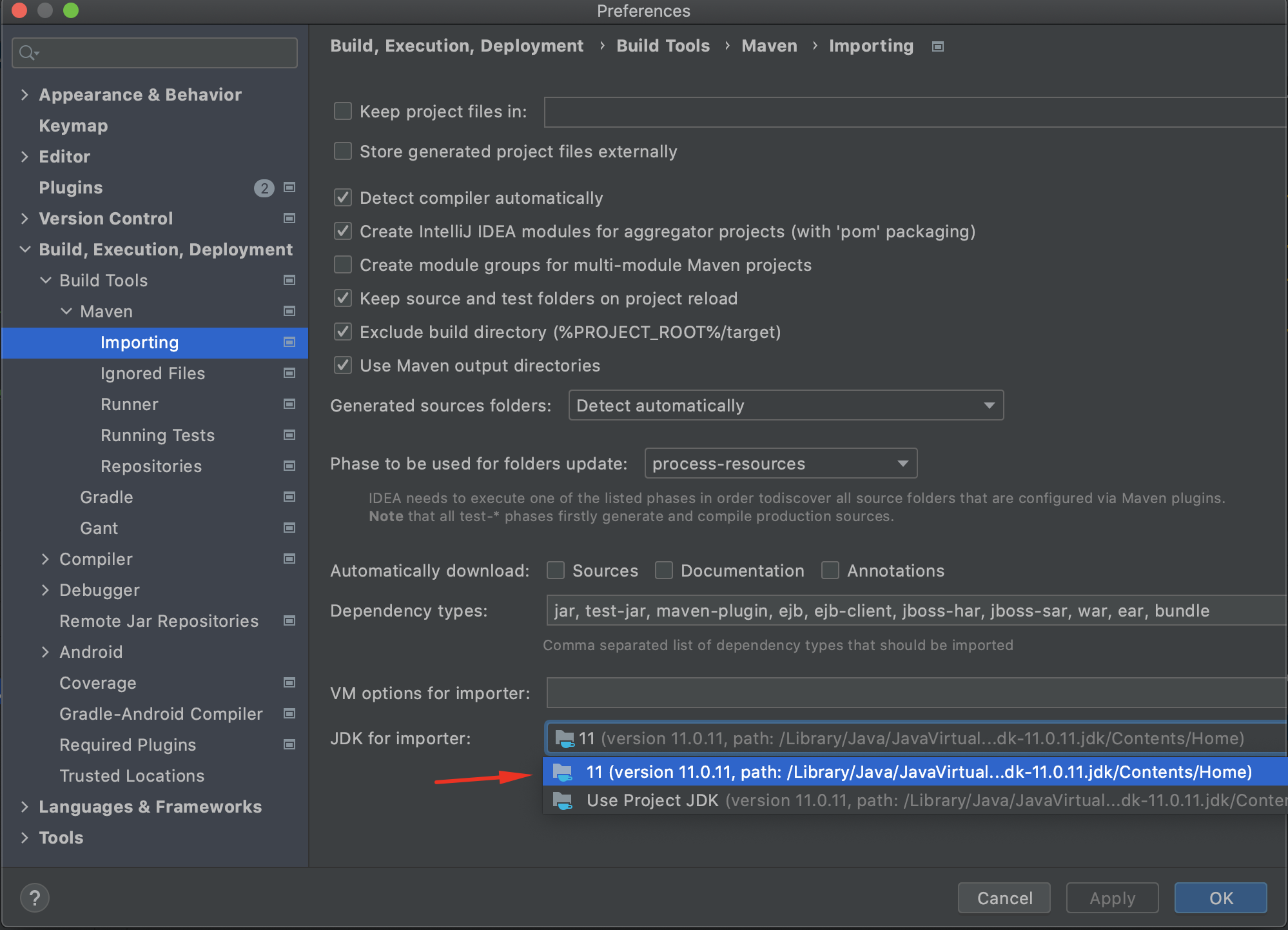 将导入器的JDK设置为安装在操作系统上的JDK (而不是内置的)