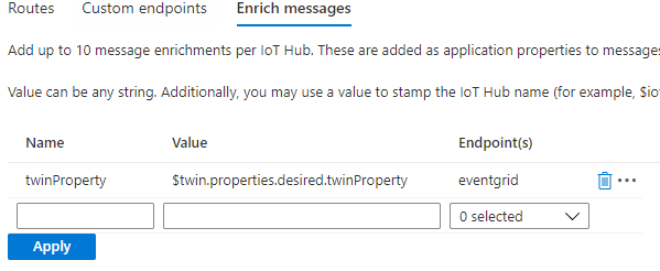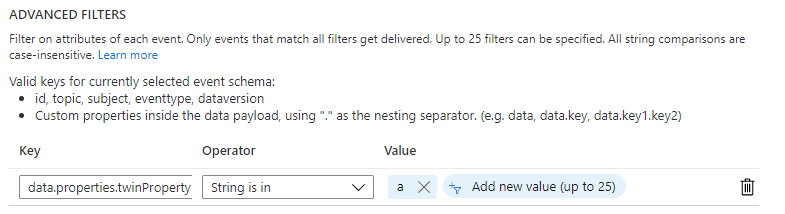 现在,只有当设备Twin有一个名为twinProperty的属性(其值为a )时,此事件订阅才会触发消息。如果更合适,您也可以在设备Twin标记上使用消息浓缩。