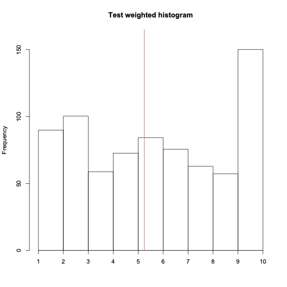 weighted.hist(vals, weights, breaks=1:10, main="Test weighted histogram")