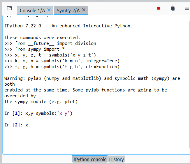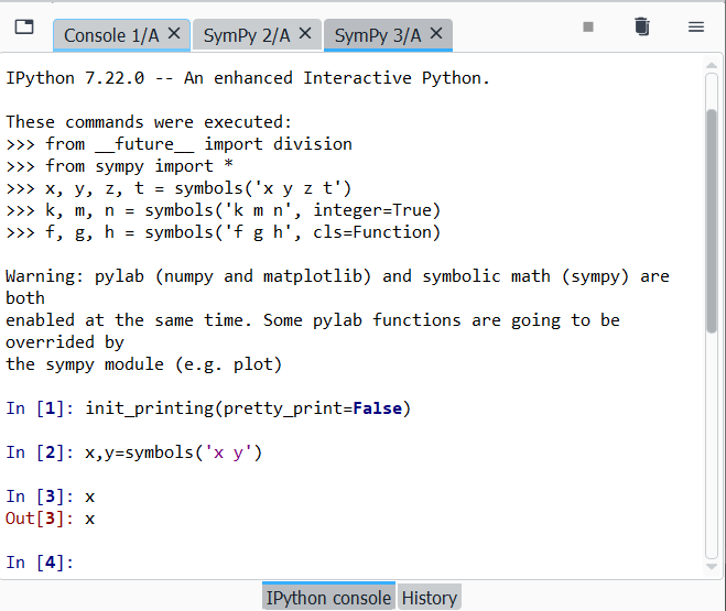 我重新安装了miniconda, sympy, spyder, qtconsole, matplotlib,并在spyder下试用了sympy。但是,来自控制台的任何输出都会冻结内核,使会话没有响应性: