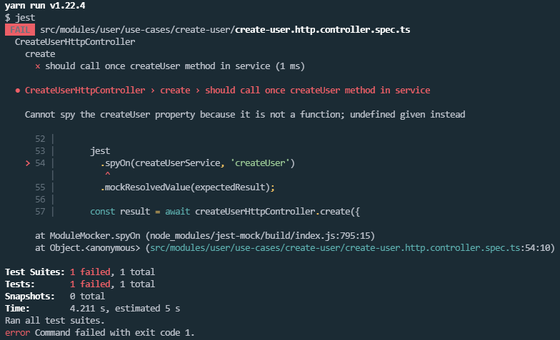 我明白这是怎么回事了。在createUserSymbol的自定义提供程序中,您使用的是为CreateUserService创建的模拟,但是这个模拟是一个工厂,而不是一个直接值,所以您应该使用useFactory代替useValue,这样Nest就可以最终调用工厂函数。如果你移除jest.fn().mockImplementation(),只需看一下会有什么