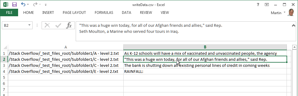 我试图从不同的文件夹中获取文本,并以CSV格式将每个文本写入一个带有文件名(*.txt)的单元格中。