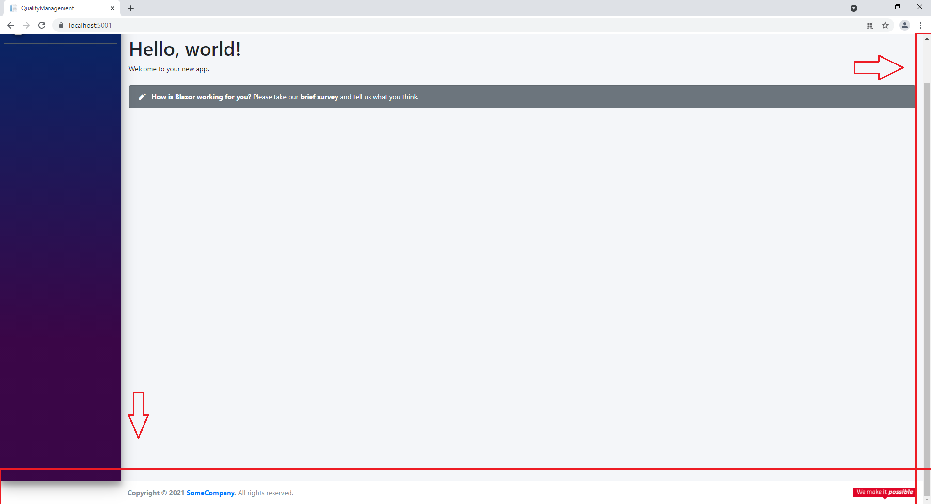 BackGround: --我刚刚开始从剃须刀/mvc (.NET 2/3)开始研究blazor (.NET 5)。我是为了菜单的目的使用AdminLTE插件的,它运行得很好。现在,从Blazor开始,我也想使用它,但是我不能让侧边栏和页脚工作。