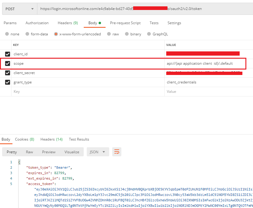 最后,您需要使用没有用户登录的客户凭证流获取访问令牌: