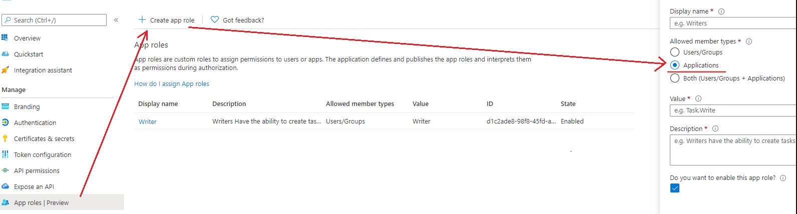 然后需要创建服务器应用程序的appRole,然后将该角色作为应用程序权限授予客户端应用程序。