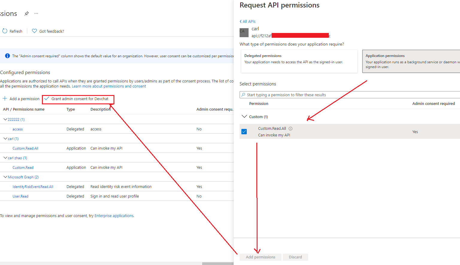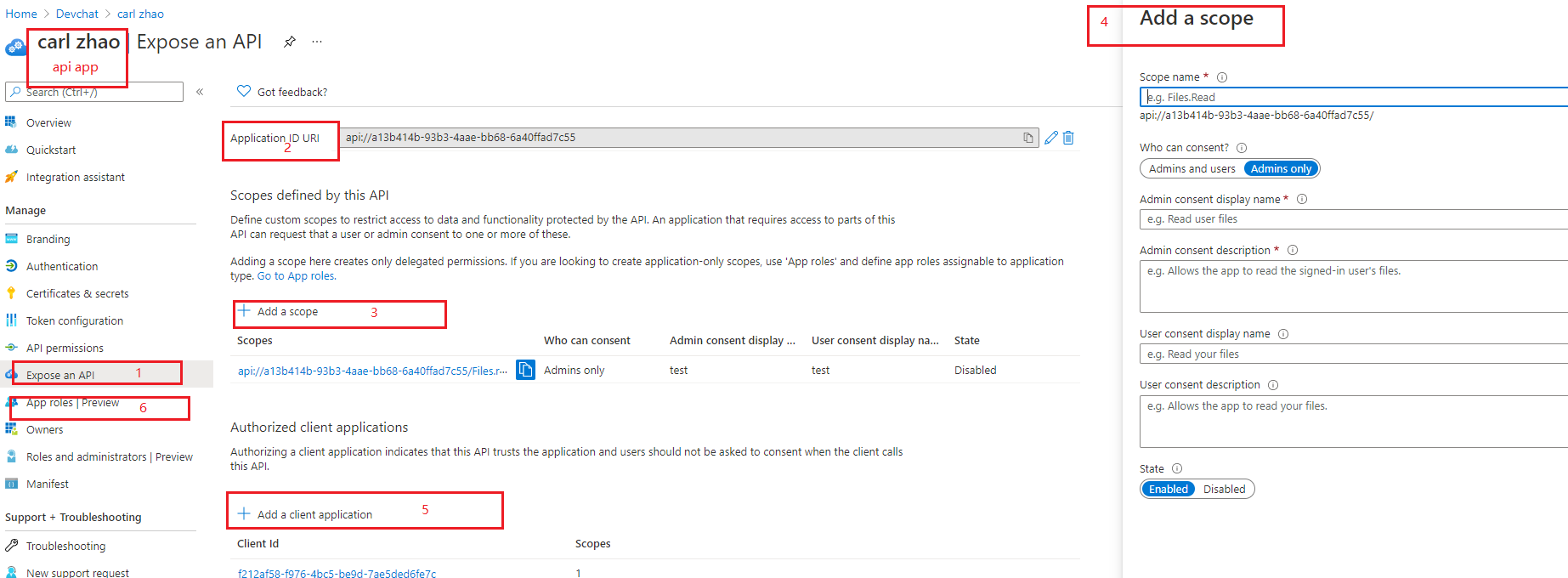 Azure portal>App registrations>Expose an API>Add a scope>Add客户端应用程序