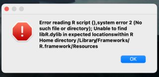 读取R脚本()、系统错误2(没有此类文件或目录)时出错;无法在R主目录/库/框架/R.framework/参考资料中的预期位置找到libR.dylib