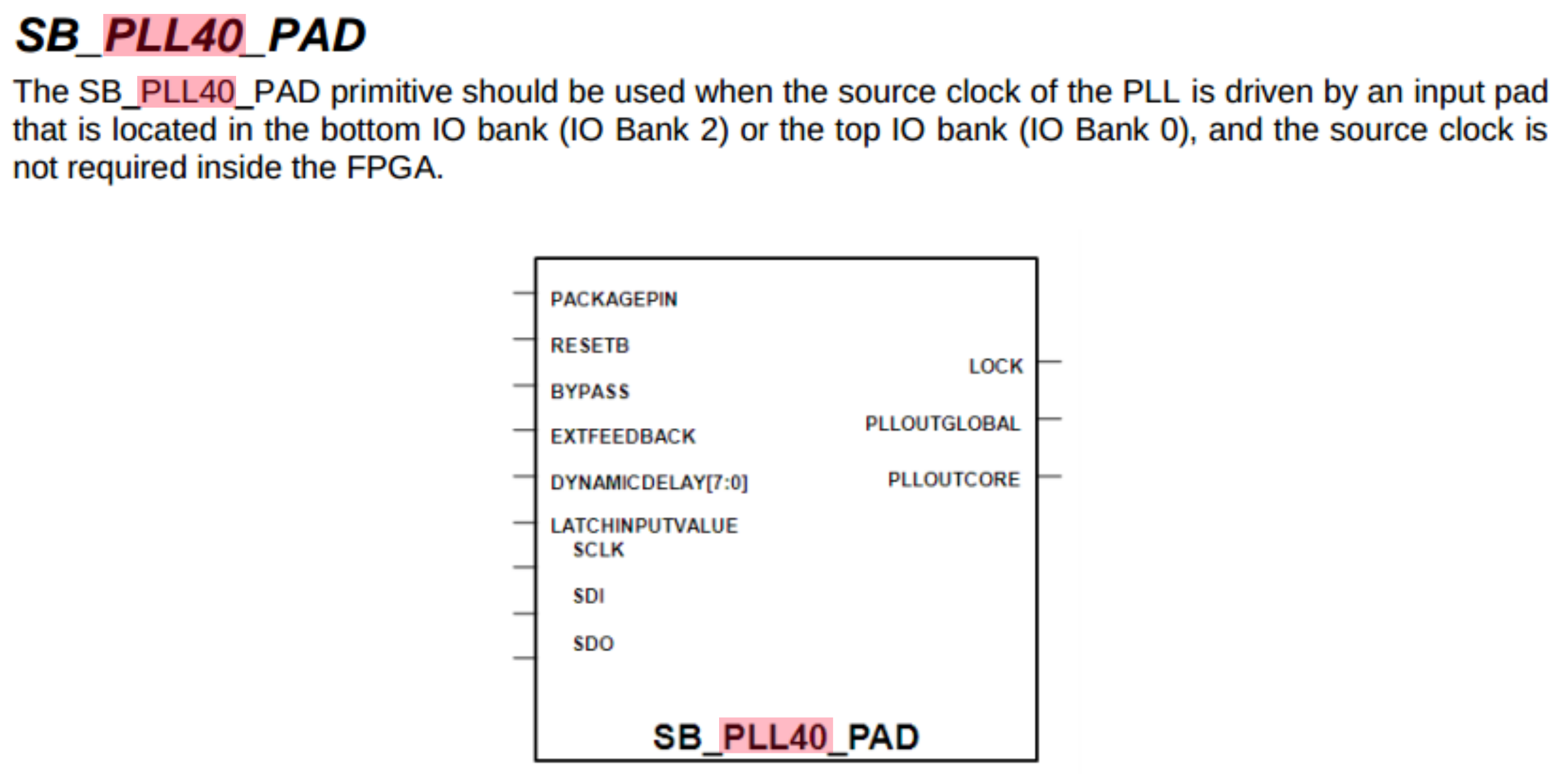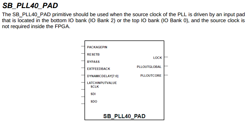 当我在上面发布的库中搜索时,我在第98页上找到了一个不错的原始SB_PLL40_PAD。这个原始人的描述完全符合冰断路器V1.0e的原理图。以下是描述: