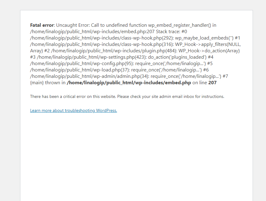 我还交叉了“wp-include/Embed.php”文件,其中存在该函数,函数在调用之前已经定义好了。您可以看到整个错误跟踪的附加屏幕截图。