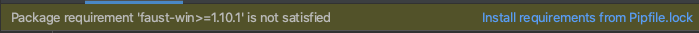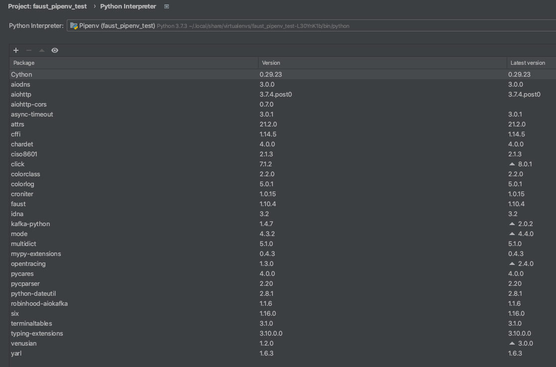 faust_win = {file = 'https://files.pythonhosted.org/packages/79/f8/3fec4f5c3e5bf1ce8bb557ae507525253fa30a5cfc5984f342b931143f75/faust-1.10.4-py2.py3-none-any.whl',version = ">=1.10.1",extras = ["aiodns", "cython"],sys_platform = "=='windows'"}我在我的开发环境中使用PyCharm。如果我在我的项目__init__.py中创建了一个faust_pipenv_test,它会自动为我的项目触发一个依赖项安装。还安装了Faust 标准依赖需求,以及附加的程序包aiodns、ciso8601和cython。